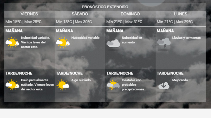 Las condiciones climáticas serán buenas en la provincia, al menos durante este viernes y sábado, con nubosidad variable y temperaturas máximas que rondarían los 30 grados. El domingo llegarían las lluvias.