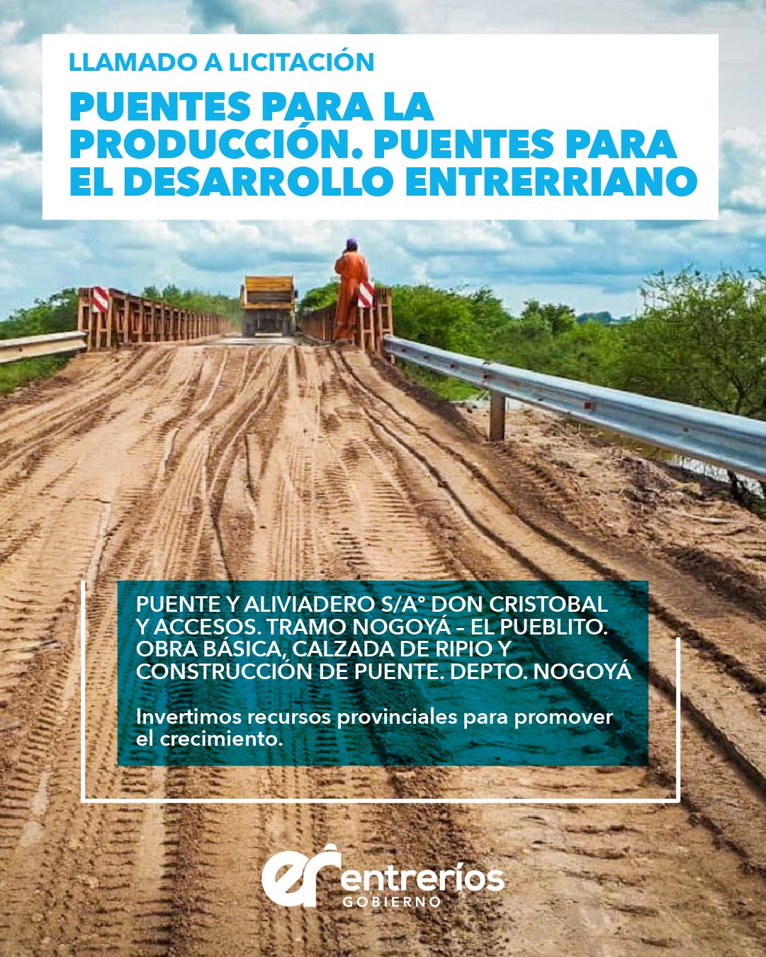 - Llamado a Licitación Pública N° 01/19 para la obra de PUENTE Y ALIVIADERO S/A° DÓN CRISTOBAL Y ACCESOS(TRAMO NOGOYÁ – EL PUEBLITO) y la obra de BÁSICA, CALZADA DE RIPIO Y CONSTRUCCIÓN DE PUENTE.