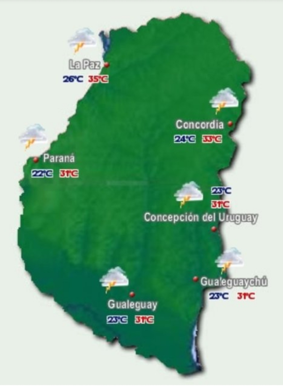 Por otra parte, el pronóstico general para todo el territorio entrerriano señala probabilidad de lluvias y tormentas aisladas para toda la jornada del sábado, con temperaturas mínimas de 22°C y máximas de 35°C.
