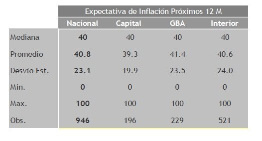 La inflación esperada sube en la Capital Federal marcó 39,3% (+4,8 puntos porcentuales), en el Gran Buenos Aires marcó 41,4% (+2,5) y en el Interior del país marcó 40,6% (+6,0).