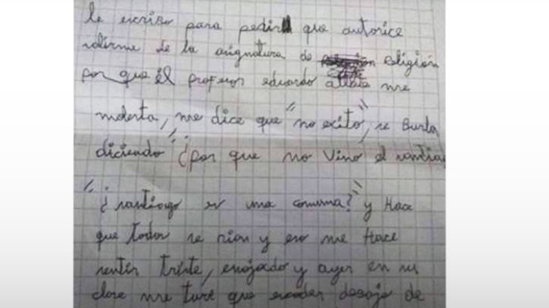 «Me dice que ‘no existo’. Se burla diciendo ‘por qué no vino Santiago’, ‘Santiago es una comuna’, y hace que todos se rían y eso me hace sentir triste» escribió el pequeño.