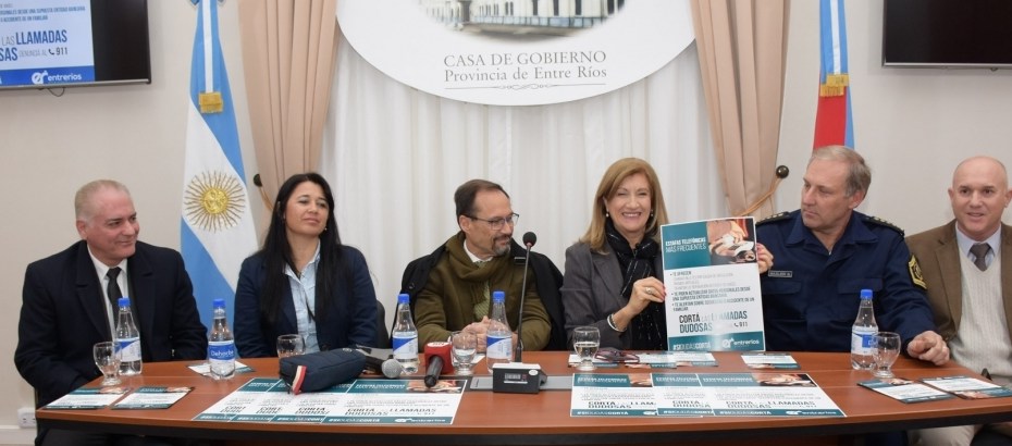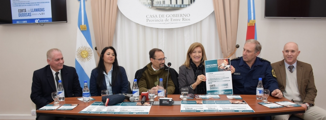 La ministra de Gobierno y Justicia, Rosario Romero, junto al jefe de Policía, Gustavo Maslein y el procurador general de la Provincia, Jorge García, presentaron la campaña de difusión para prevenir las estafas telefónicas: “Cortá las llamadas dudosas”.
