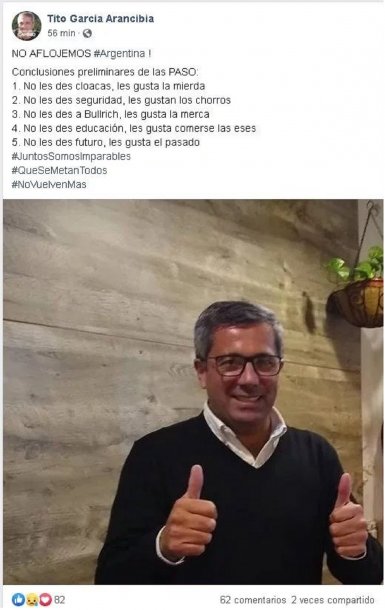 «No les des cloacas, les gusta la mierda», manifestó a través de sus redes sociales Ernesto «Tito» García, el delegado provincial de San Juan de la Comisión Nacional de Regulación del Transporte (CNRT). El posteo fue realizado luego de conocerse el resultado de las PASO.