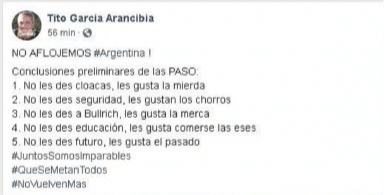 Un funcionario de Juntos por el Cambio lanzó, vía Facebook, una secuencia de exabruptos ofensivos hacia los votantes de la fórmula Fernández – Fernández.