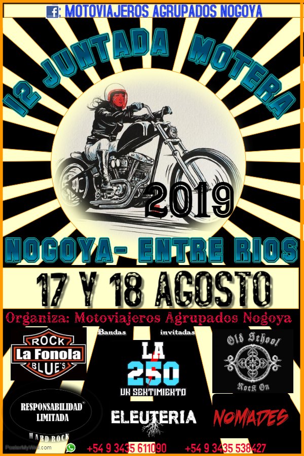 En el Polideportivo Municipal de Nogoyá, se podrá disfrutar de espectáculos, música en vivo y juegos de los que participarán los motociclistas. La 12° Jornada Motera es organizada por Motoviajeros Agrupados de Nogoyá y Moteros Independientes de Lucas González.
