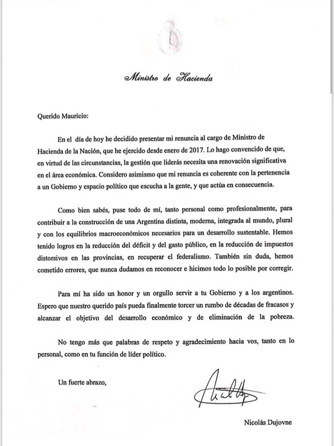 La carta de renuncia de Dujovne está escrita en tono coloquial: tutea al presidente cuando anuncia su declinación como ministro de Hacienda.