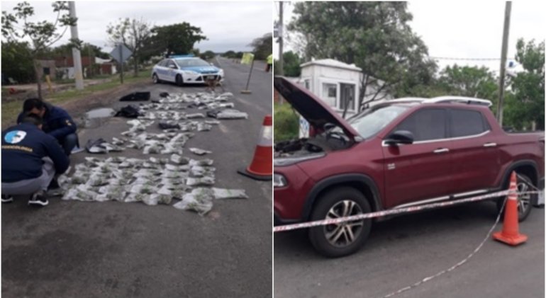 Según informaron fuentes policiales, el personal de la División Tóxicos dependiente de la Jefatura Departamental La Paz detectó, con la asitencia de la perra antinarcóticos Lola de la Policía de Prevención Vial, con asiento en el kilómetro 646 de la Ruta Nacional Nº 12, una camioneta Fiat Toro de color bordó conducida por un hombre de 43 años oriundo de Posadas, Misiones, acompañado de otro, de 49 años, oriundo de Colonia Liebig, Corrientes.
