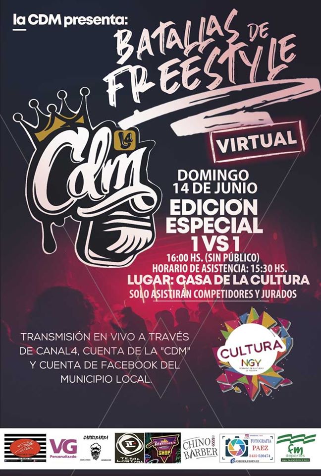 la Coordinación de Cultura y Turismo del Gobierno de la Ciudad de Nogoyá informaron que el domingo 14 y domingo 28, en Casa de la Cultura, a la hora 16 se realizarán batallas virtuales de frestyle, sin público, donde sólo intervendrán los participantes y el jurado designado, manteniendo normas de seguridad ante la actual situación sanitaria por el coronavirus.
