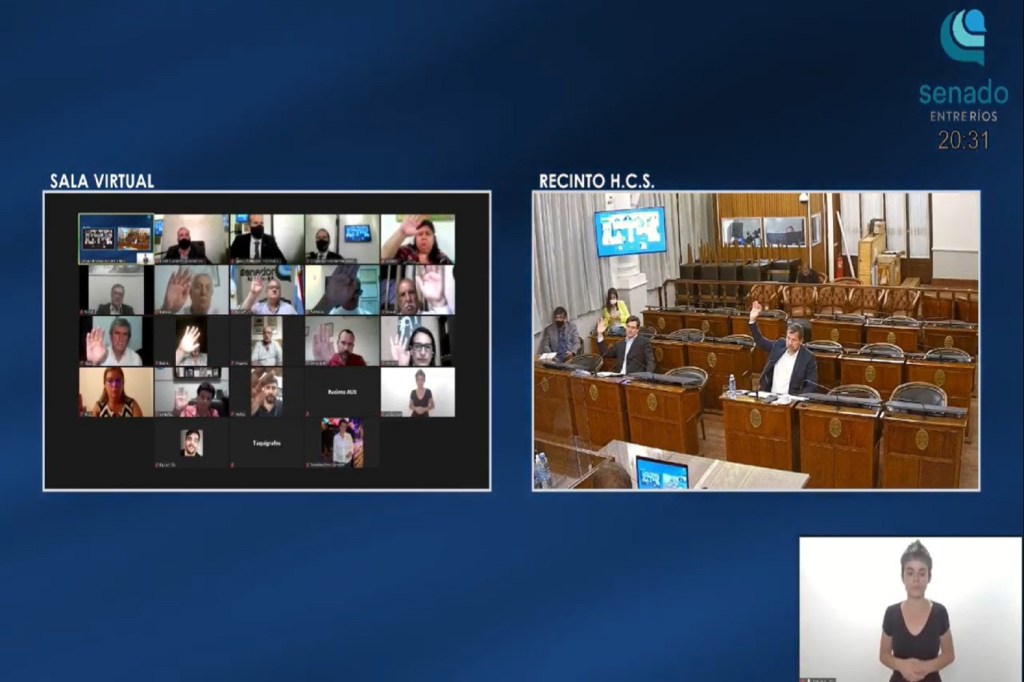 La Cámara de Senadores de la Provincia celebró este martes la primera sesión de prórroga del 141º período legislativo. El debate fue presidido desde el Recinto por el vicepresidente 1º del cuerpo, senador Daniel Olano (Islas del Ibicuy- Frente Justicialista), acompañado el secretario y prosecretario Lautaro Schiavoni y Leonardo Centurión respectivamente; además, estuvieron presentes los presidentes de bloque Armando Gay (Concordia-Frente Justicialista) y Francisco Morchio (Gualeguay- Cambiemos). El resto de las y los senadores asistieron a la sesión mediante videoconferencia.