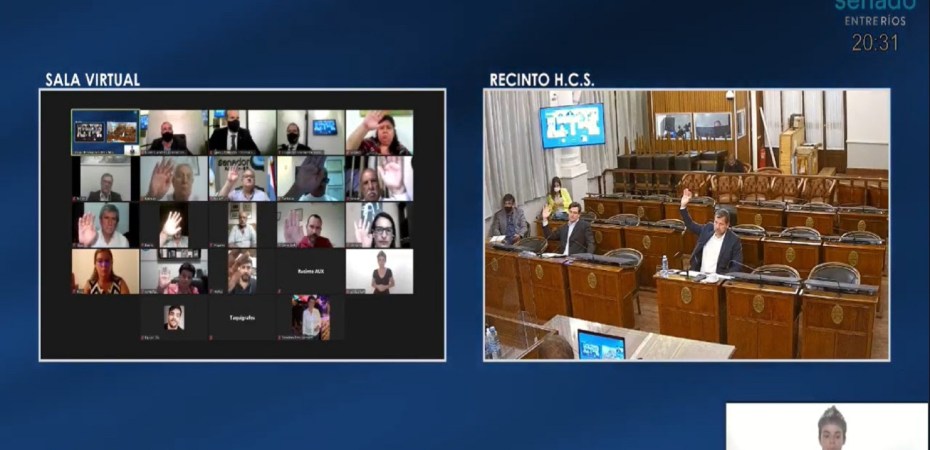 La Cámara de Senadores de la Provincia celebró este martes la primera sesión de prórroga del 141º período legislativo. El debate fue presidido desde el Recinto por el vicepresidente 1º del cuerpo, senador Daniel Olano (Islas del Ibicuy- Frente Justicialista), acompañado el secretario y prosecretario Lautaro Schiavoni y Leonardo Centurión respectivamente; además, estuvieron presentes los presidentes de bloque Armando Gay (Concordia-Frente Justicialista) y Francisco Morchio (Gualeguay- Cambiemos). El resto de las y los senadores asistieron a la sesión mediante videoconferencia.