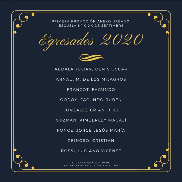 La primera promoción del Anexo Urbano de la Escuela N°10 XX de Septiembre, el mismo se llevo adelante en la Escuela Agote ayer sábado 27-02 a las 20:00hs.