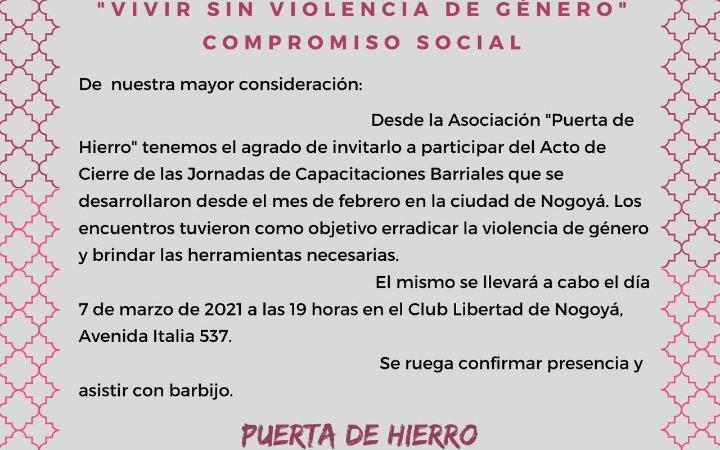 En el mes de enero y con trabajos en los diferentes barrios ( asistencia) se dio lugar a una problemática planteada por las mujeres que nos ayudan con copas de leche, dicha fue “ violencia hacia las mujeres”, desde ese momento, parte de la Asociación Puerta de Hierro y a través de un proyecto presentado por Yonas Rocio (Prof. de educación inicial) y Marianela Manassali (abogada) a la Secretaría de la mujer, Género y Diversidad de la provincia a cargo de Mariana Broggi , se dio lugar al trabajo en el territorio con 14 barrios de la cuidad destinados a la jornada capacitación, desde que se empezó hasta la fecha llevamos más de 80 mujeres, niñas y adolecentes capacitadas identificando además otras problemáticas que deben solucionarse de manera inmediata
