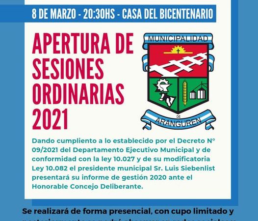 Dando cumpliento a lo establecido por el Decreto N° 09/2021 del Departamento Ejecutivo Municipal y de conformidad con la ley 10.027 y de su modificatoria Ley 10.082 el presidente municipal Sr. Luis Siebenlist presentará su informe de gestión 2020 ante el Honorable Concejo Deliberante.