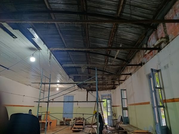 Ya se ha culminado con los trabajos de extracción de la cubierta y cielo raso existentes, seguidamente se agregaran trabajos de mejoras en los conductos de desagüe pluvial y reemplazo de canaletas que se encuentren en mal estado.