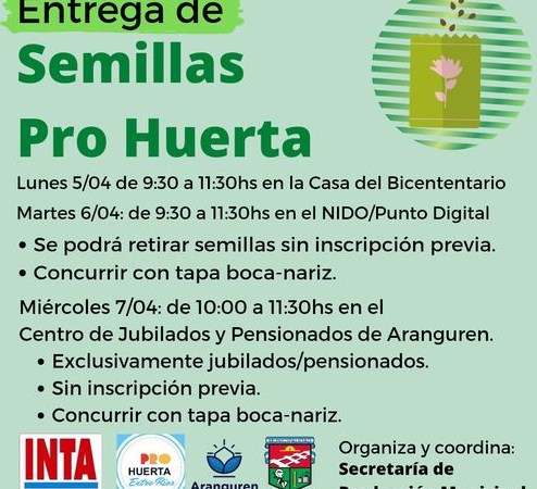 Martes 6/04: de 9:30 a 11:30hs en el NIDO/PDSe podrá retirar semillas sin inscripción previa, concurrir con tapa boca-nariz.