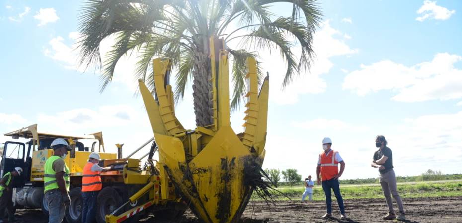 Mediante un equipo trasplantador de 4 palas hidráulicas, que extrae un pan de tierra de casi 7000 Kg. y evita los movimientos bruscos de cada ejemplar, serán relocalizadas las palmeras dentro de la zona de camino de la R.N. N° 18.