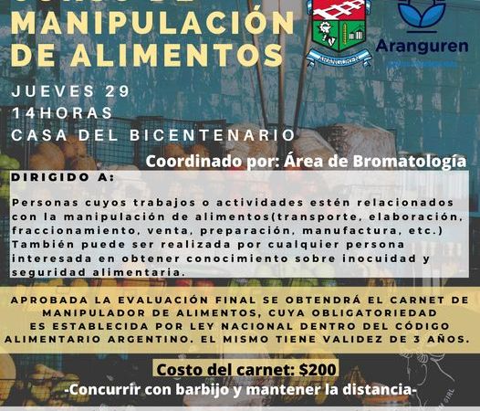 Se deberá llevar barbijo, respetar las medidas de distanciamiento social y protocolos vigentes COVID19.Coordina el Área de Bromatología de la Municipalidad de Aranguren.