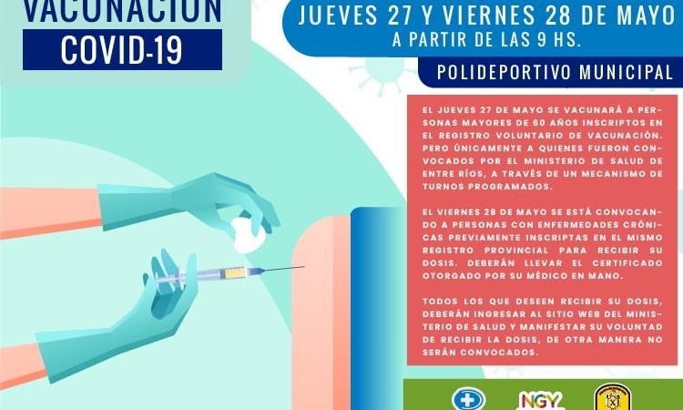 Este jueves 27 de mayo se vacunará con primera dosis, a personas mayores de 60 años inscriptos en el Registro Voluntario de Vacunación. Será únicamente a quienes fueron convocados por el Ministerio de Salud de Entre Ríos, a través de un mecanismo de turnos programados.