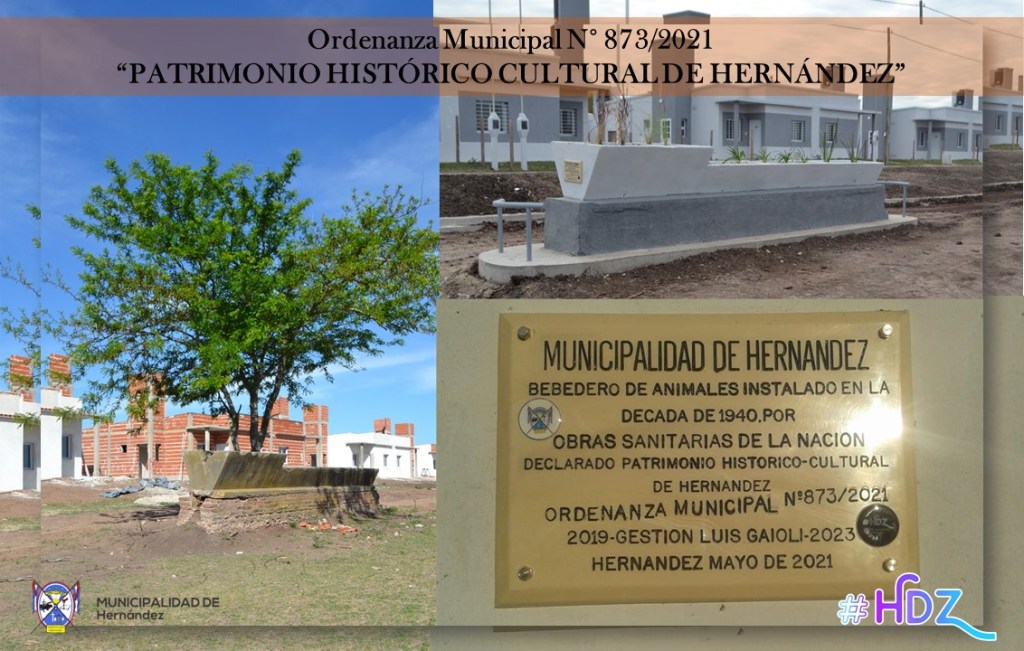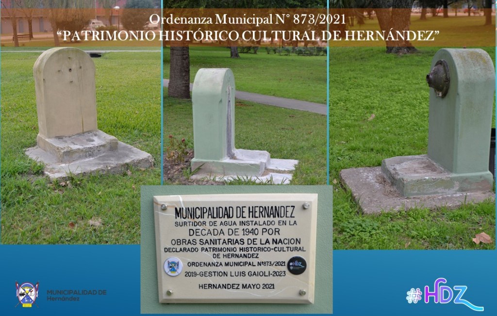 Mediante Ordenanza Municipal N° 873, se declaró Patrimonio histórico-cultural de Hernández a los tres surtidores de agua para consumo humano ubicados, actualmente, en el Parque Urquiza; y al bebedero de animales ubicado en calle San Juan, entre Av. Antártida Argentina y Tomás de Rocamora de la localidad de Hernández.
