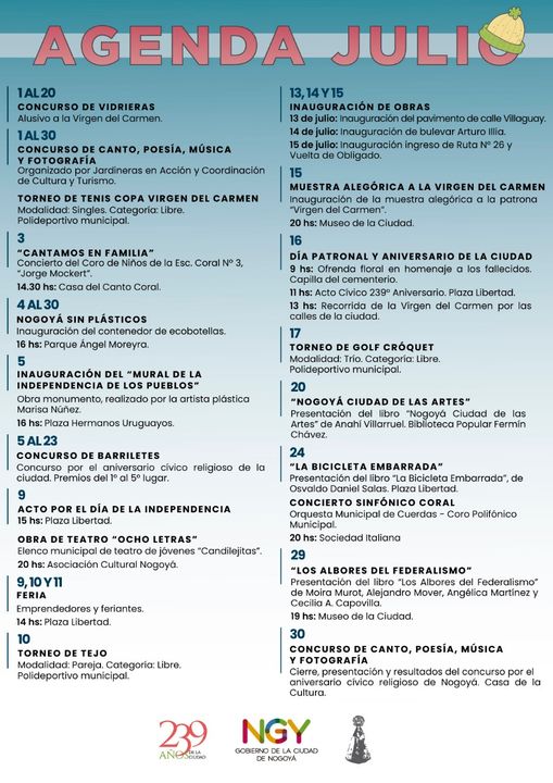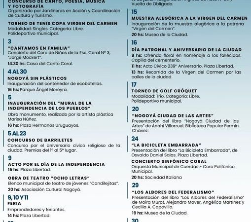 Desde el Gobierno de la Ciudad de Nogoyá se presentó la agenda del 239º aniversario de la ciudad. La iniciativa tiene como objetivo difundir las actividades organizadas y auspiciadas por la municipalidad, contemplando la situación sanitaria y epidemiológica producto de la pandemia por el Covid-19.