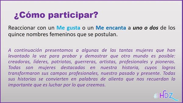 Debés reaccionar con un Me gusta o un Me encanta a uno o dos de los quince nombres femeninos que se presentan en la página del Municipio de Hernández, y que consideres que merecen un reconocimiento por su accionar, por su historia, por su legado. La elección es únicamente sobre la nomenclatura publicada, no aceptándose otras opciones.