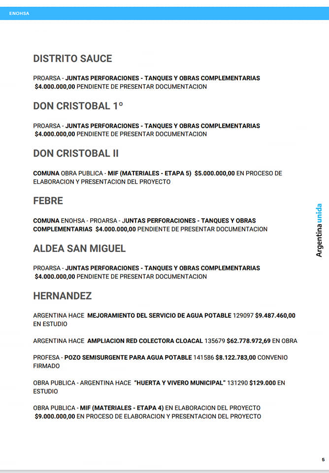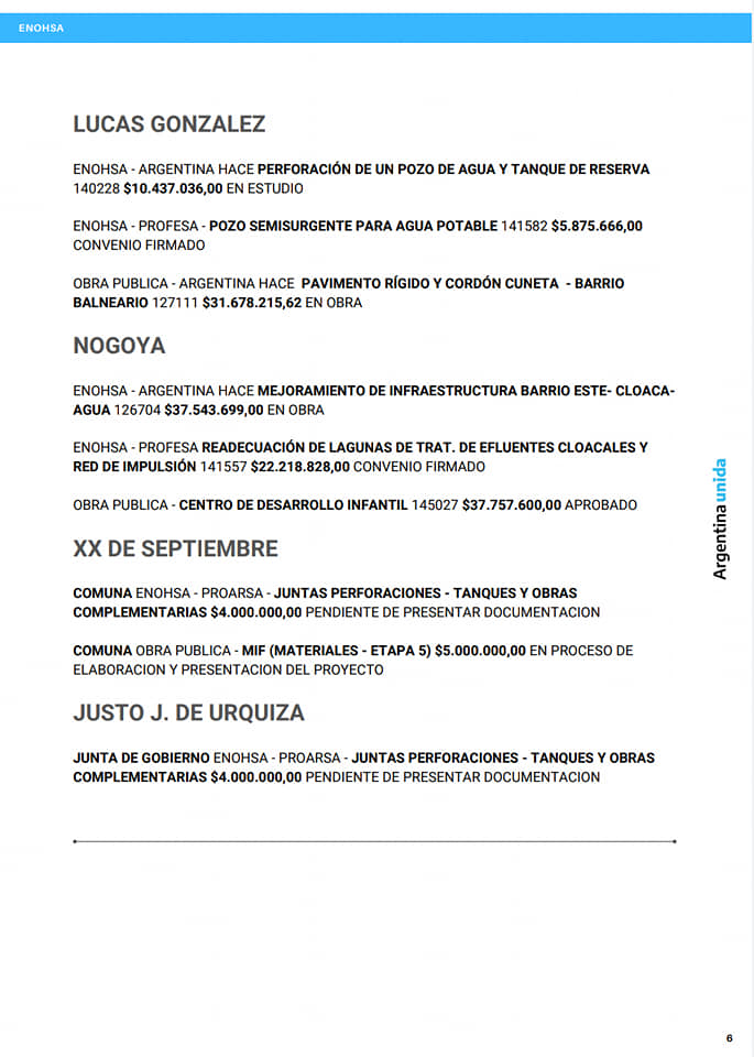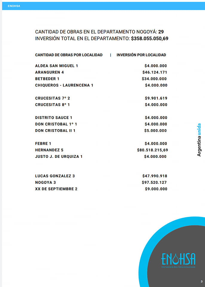 En el Departamento Nogoyá se están ejecutando y próximo a ejecutar obras de saneamiento hidrico financiadas por el ENOHSA.