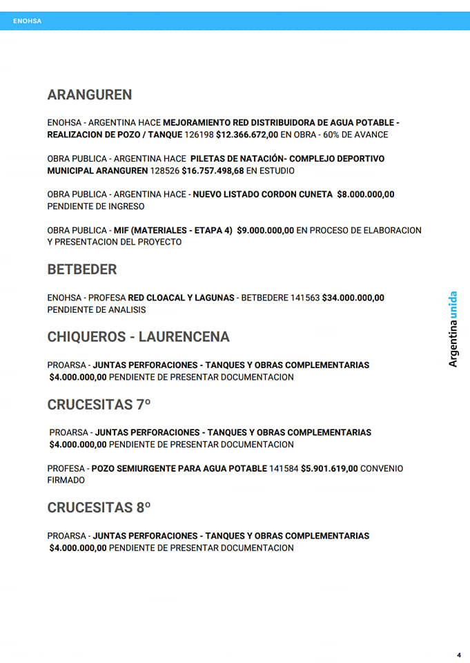 Los cuatro Municipios, 3 Comunas y 9 Juntas de Gobierno se encuentran con obras, sin distinción de colores políticos, aplicando una verdadera inclusión y distribución de las mismas.