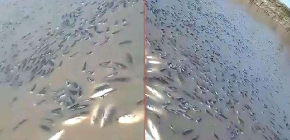 En pleno río Paraná, y por efecto de la bajante, miles de peces quedaron estancados, y tras un par de horas perecieron, dejando una alfombra sobre la poca agua que queda.
