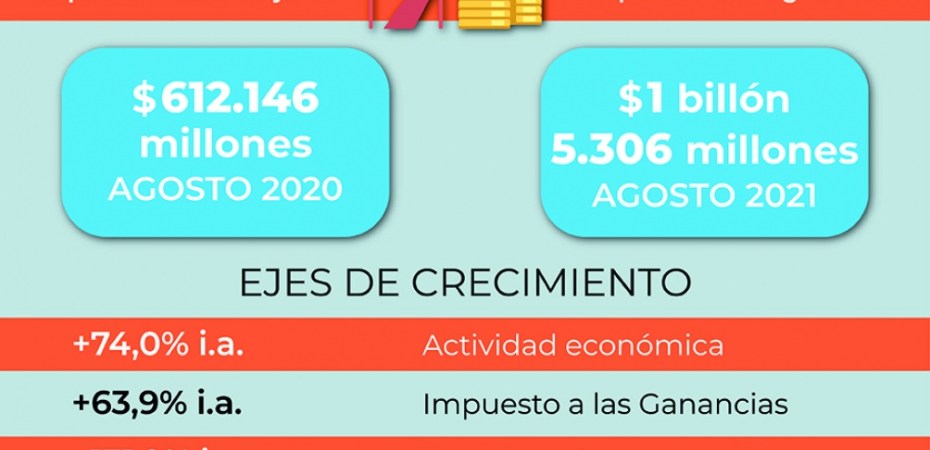 El informe detalló que en agosto los ingresos en concepto de impuestos Internos Coparticipados subieron 60,5%, al sumar $ 21.300 millones; mientras que el Impuesto a los Créditos y Débitos marcó una mejora de 66,%, al alcanzar casi $ 64.000 millones.