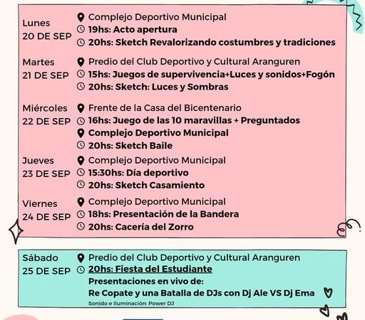 Presentaciones en vivo de Re Colate y una Batalla de DJs con DJ Ale y DJ Ema. Sonido e iluminación de Power DJ. (Estudiantes de 12 a 18 años de Aranguren ingresan gratis y las anticipadas estarán prontamente a la venta)