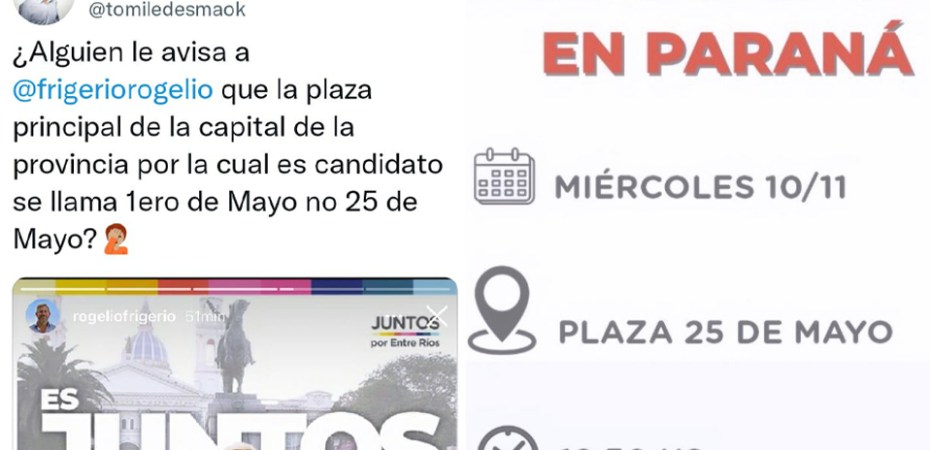 Juntos por Entre Ríos publicó un flyer con el acto de campaña que se desarrollará este miércoles en el centro paranaense. Sin embargo, los datos tienen como error el nombre de la plaza principal de la capital entrerriana y el tercero en la Lista del Frente de Todos, Tomás Ledesma, aprovechó para atribuirle el error al «porteño» Rogelio Frigerio.