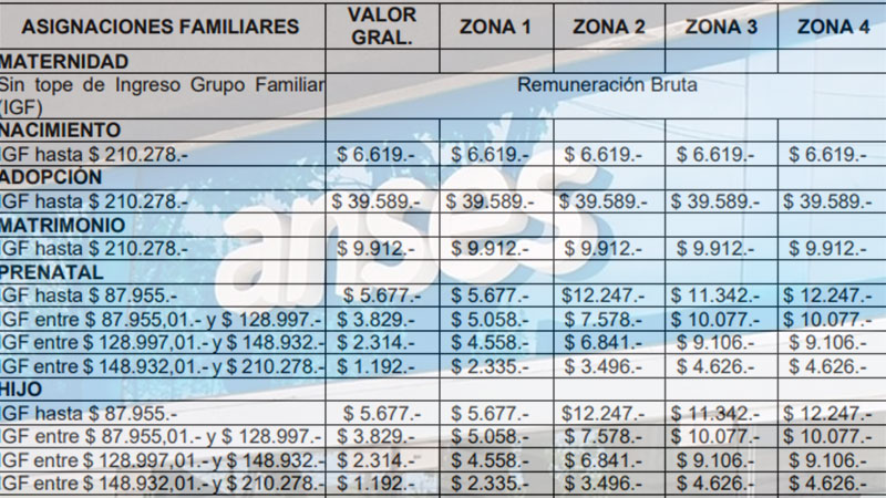 Categorías E: prenatal e hijo, $ 2.314; por hijo discapacitado, $ 8.256 y ayuda escolar anual, $ 4.758.