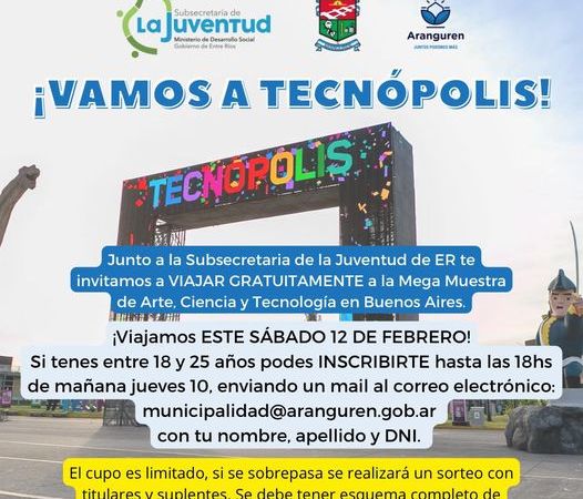 Si tenes entre 18 y 25 años (y sos residente en Aranguren) podes INSCRIBIRTE hasta las 18hs de mañana jueves 10, enviando un mail al correo electrónico: municipalidad@aranguren.gob.ar