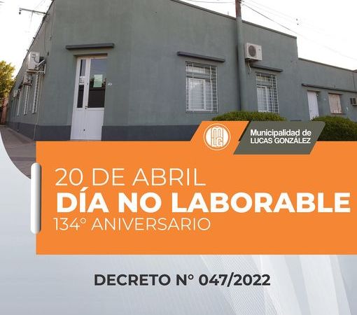 A través del Decreto N° 047/2022 y en el marco de los festejos con motivo del 134° Aniversario de la fundación de la ciudad de Lucas González, el Ejecutivo municipal dispuso para el día 20 de abril inhábil laboral.