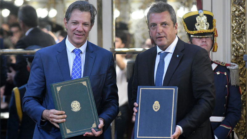 El ministro de Economía, Sergio Massa afirmó que «la decisión de ambos gobiernos (de Argentina y Brasil) es empezar a trabajar para lograr una moneda común de ambos países y con invitación a otros países de la región, para encontrar un instrumento económico y comercial que habilite a profundizar el sistema de comercio entre ambos países y dentro de la región y el Mercosur».