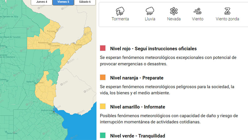 Mientras tanto, el Servicio Meteorológico Nacional emitió una alerta amarilla por intensas lluvias para el viernes a la mañana y a la tarde. Abarca los departamentos Paraná, Diamante, La Paz, Nogoyá, Villaguay, Colón, Gualeguaychú, Islas del Ibicuy, Tala, Uruguay, Victoria y Gualeguay.