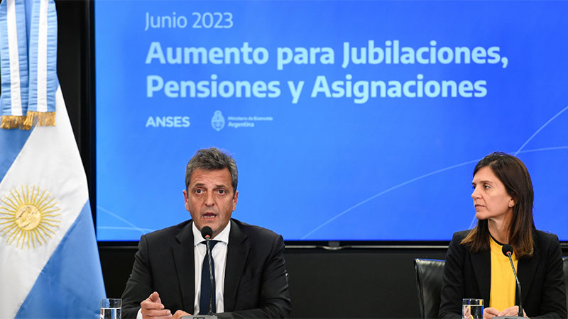 El ministro de Economía, Sergio Massa, y la directora ejecutiva de Administración Nacional de la Seguridad Social (Anses), Fernanda Raverta, anunciaron un aumento de haberes de 20,92% correspondiente a la Ley de Movilidad y el pago de bonos refuerzo para las jubilaciones y pensiones mínimas de $15.000 en junio, $17.000 en julio y $20.000 en agosto.