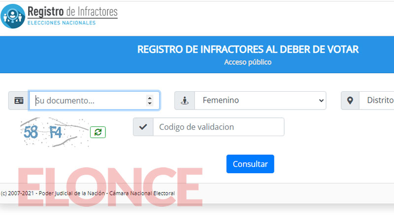 Para revisar el Registro de Infractores hay que entrar al sitio infractores.padron.gov.ar, escribir el número de documento, seleccionar el género y el distrito electoral, escribir el código de validación y apretar el botón «Consultar».
