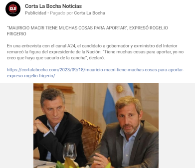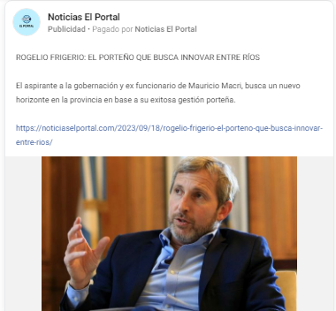 Entre las páginas oficiales de Frigerio y las páginas armadas sólo para la campaña electoral hay aproximadamente unos 150 millones de pesos en publicidad positiva en páginas que habrían sido creadas solo con el propósito de inflar la candidatura de Frigerio.