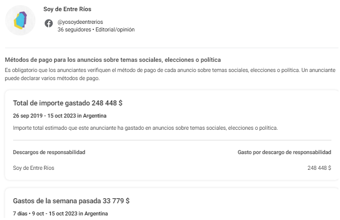 Ingresando a la Biblioteca de Anuncios de Meta, se puede comprobar un gasto de aproximadamente 300 millones de pesos solamente para la campaña digital de Juntos por el Cambio. Y eso que hablamos únicamente de la Provincia Entre Ríos.