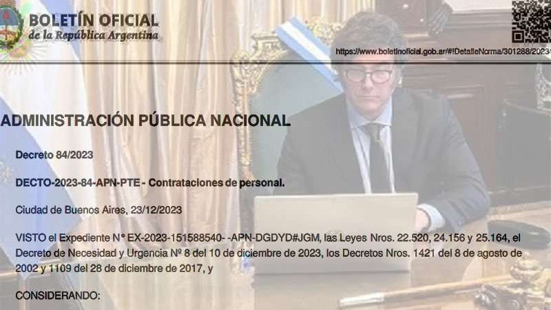 Rescinde todas las contrataciones efectuadas en el marco de la Ley Marco de Regulación del Empleo Público Nacional a lo largo del 2023 o que concluyan el próximo 31 de diciembre. La medida fue publicada en el Boletín Oficial.