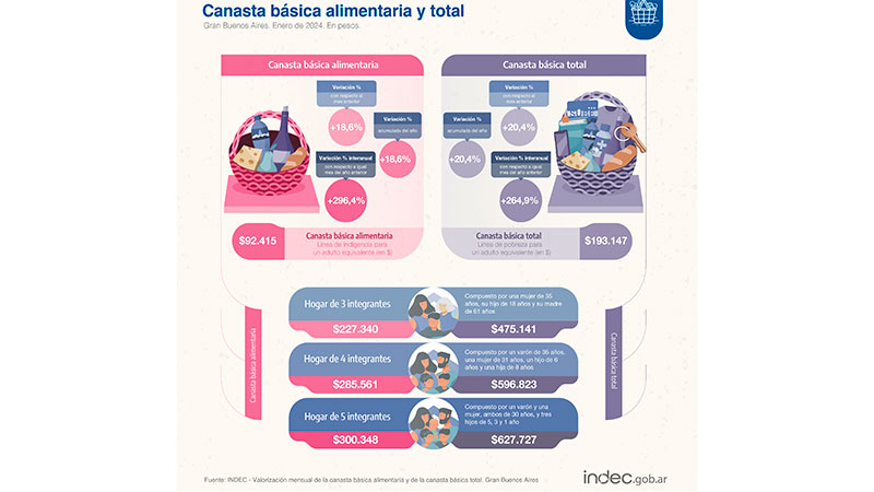 El costo de la Canasta Básica Alimentaria (CBA) subió 18,6% en enero, por lo que una pareja con dos hijos necesitó percibir ingresos por $ 285.661 para no caer en situación de indigencia y $596.823 para no ser pobre, informó INDEC.
