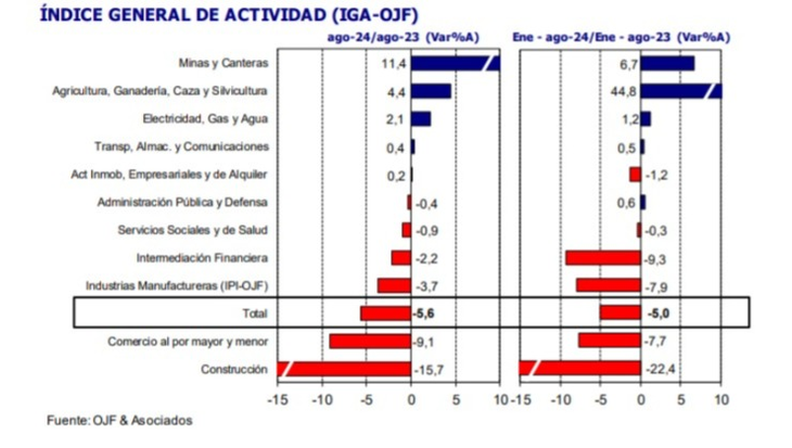 Así lo refleja el informe del Índice General de Actividad (IGA) de la consultora Orlando J. Ferreres y Asociados (OJF). Señala que, luego de marcar un avance de 1% mensual en julio, la actividad económica volvió a retroceder en agosto y registró una contracción de 0,6% respecto del séptimo mes en la medición desestacionalizada. En la comparación anual, el índice general fue negativo en 5,6%, con solo dos sectores que registran las peores tasas:
