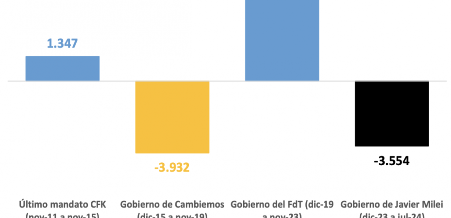 “En el último gobierno de Cristina Fernández de Kirchner se generaron 1.347 puestos de trabajo. Durante el gobierno de Mauricio Macri, se destruyeron 3.932. En el gobierno de Alberto Fernández, se generaron 5.444. Y en los primeros ocho meses de Milei, ya se destruyeron prácticamente la misma cantidad de puestos que durante el macrismo, alcanzando los 3.554”, se enumera.